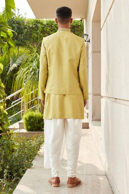 Green Cotton, Silk, Tussar Embroidery Emir Pintuck Jacket Kurta Set