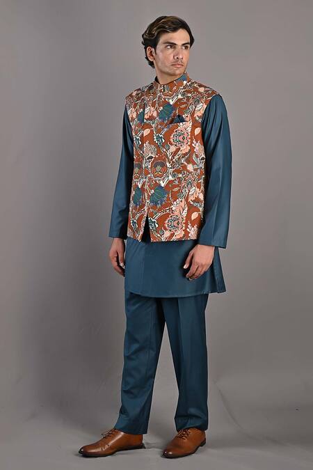 Maroon overlap style bundi with digital printed floral motifs. Comes with teal green kurta and pant set.