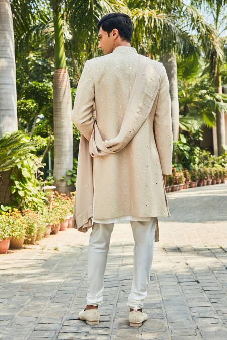 Beige sherwani featuring floral Mughal chikankari embroidery and sequin highlights. Paired with an off-white kurta, churidar, and matching dupatta.