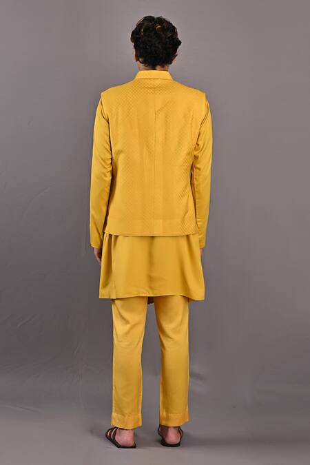 Buy_Bohame_Yellow Kurta And Pant Tencel Kai Textured Bundi With Set_at_Aza_Fashions