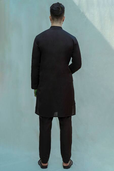 Black overlap plain kurta with front pleats & uneven hemline. Comes with straight black pants.