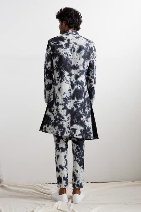 Light grey bandhgala with all-over tie-dye pattern, stylized placket, pleat detail, patch pocket & asymmetric hem. Comes with pant.