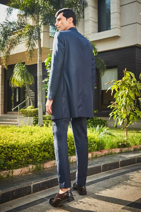 Navy blue bandhgala featuring pintucked details and a band collar. Paired with coordinating pants.
