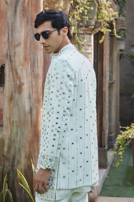 Intricate chikankari embroidery with mirror embellishments, Full sleeves design for the jacket and kurta, Stand collar neckline for a formal look