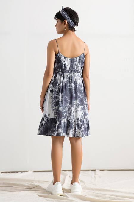 Indigo, white tie dye dress, featuring pleated yoke and ruffle hem, with plunge V-neck and noodle straps.