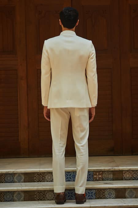 Off white plain bandhgala featuring a mandarin collar and full sleeves. Paired with coordinating pant in a relaxed fit.