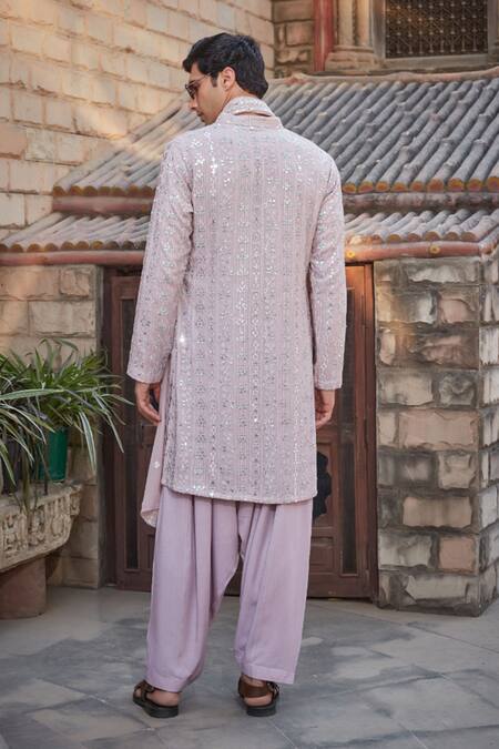 Lilac straight kurta featuring chikankari embroidery all over with mirror detailing. Paired with an embroidered dupatta and a solid salwar.