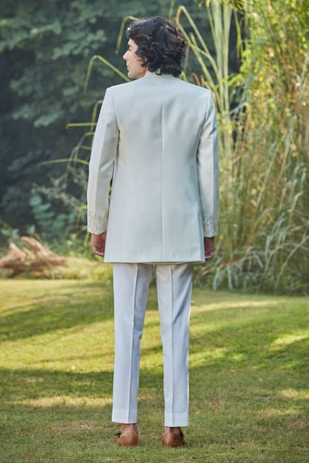 Off white bandhgala featuring sequin and bead embroidered chevron motifs. Paired with matching pant for a complete look.