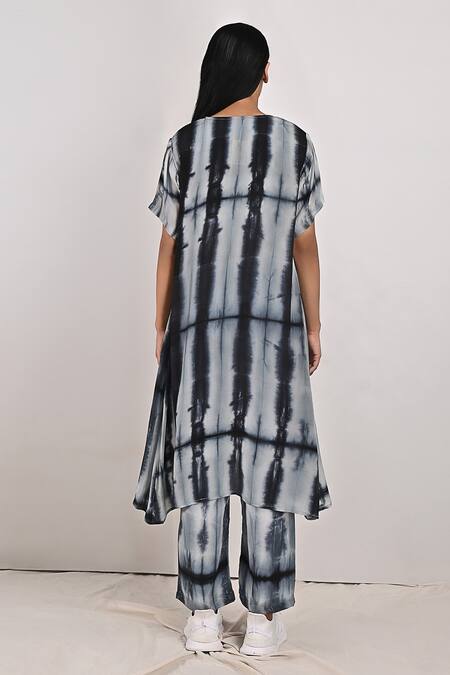 Light grey, black front open jacket with tie & dye print. Paired with printed crop top & printed pant.