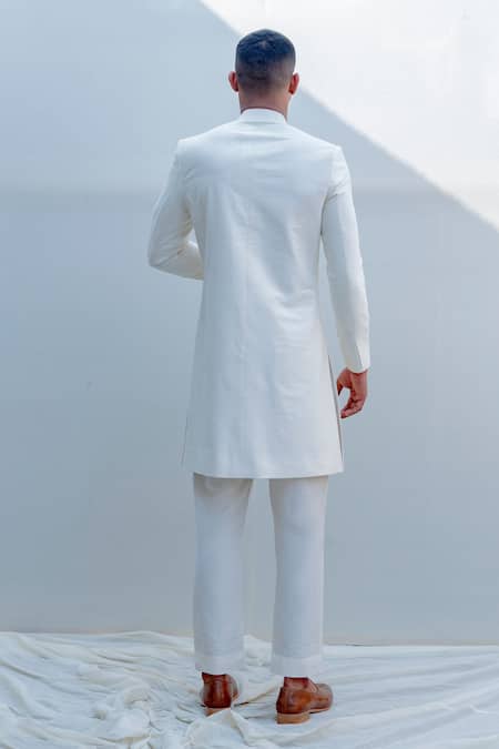 Off white achkan style sherwani with front button placket & patch pocket. Paired with shirt, elasticated pant & pocket square.