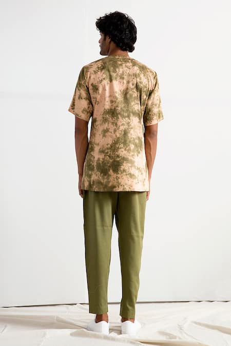Beige short kurta with all-over tie-dye pattern, flap detail, half sleeves, patch pocket & pintucks. Comes with green loose fit pant.
