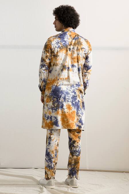 Off-white kurta with all-over tie-dye pattern, band collar, stylized button placket & full sleeves. Comes with pant.