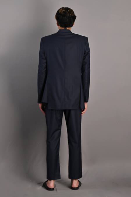 Navy blue asymmetric jacket style bandhgala with tuck detailing. Comes with straight pant.