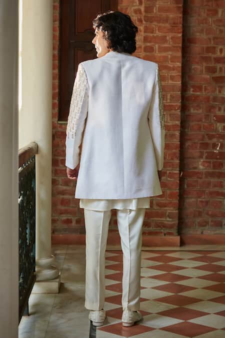 White cutdana embroidered jacket featuring full sleeves and open front. Paired with a solid kurta and pant in tussar fabric.