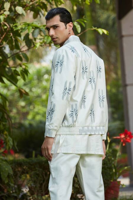 Off white bomber jacket featuring stitch embroidered abstract floral motifs. Paired with a short kurta and pant.