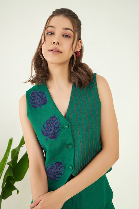 Forest green sleeveless vest crafted in 100% linen featuring bullian leaf and lines embroidery detailing. Paired with a plain flared trouser for a complete look.