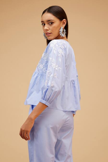 Blue top with a V-neckline and three-quarter sleeves featuring floral threadwork on the yoke