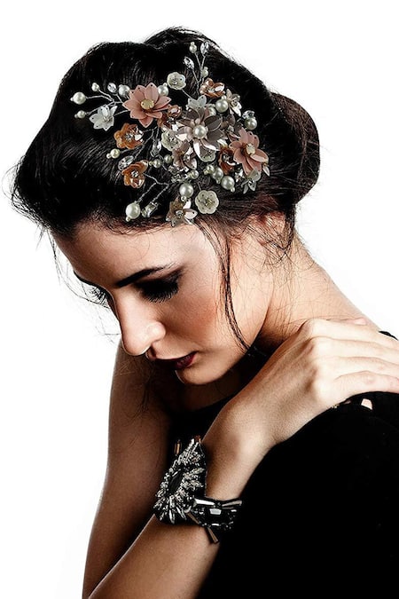 Floral work with pearl embellishments, Metal sequins detailing, Crystal stone accents