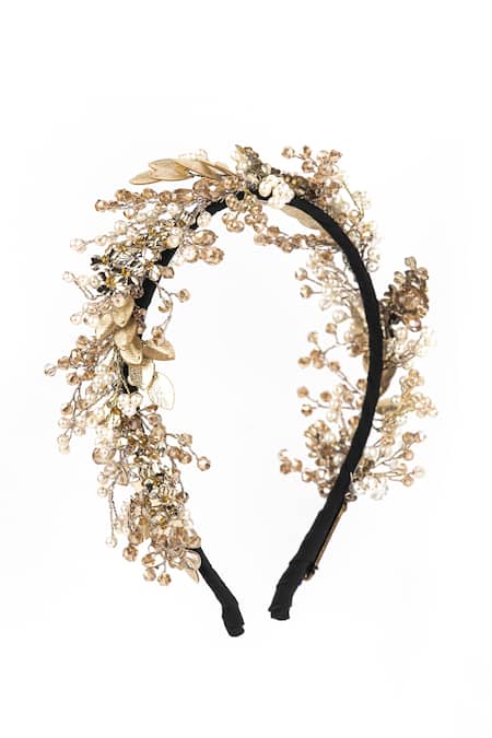 Gold hairband featuring hand beaded flowers adorned with pearl and sequins embellishments