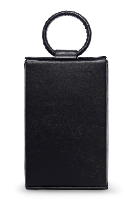 Black leather sling bag featuring a top handle and twist lock clasp