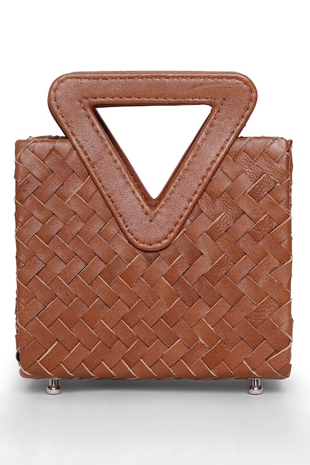 Brown woven leather sling bag featuring a structured top handle and a detachable metal chain sling