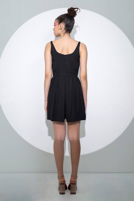 Buy_Pocketful Of Cherrie_Black Crepe Scoop Neck Box Pleated Romper_at_Aza_Fashions