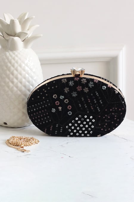 Black oval-shaped clutch featuring intricate thread and sequin embroidery. Comes with a diamond floral knob and a metallic detachable sling chain.