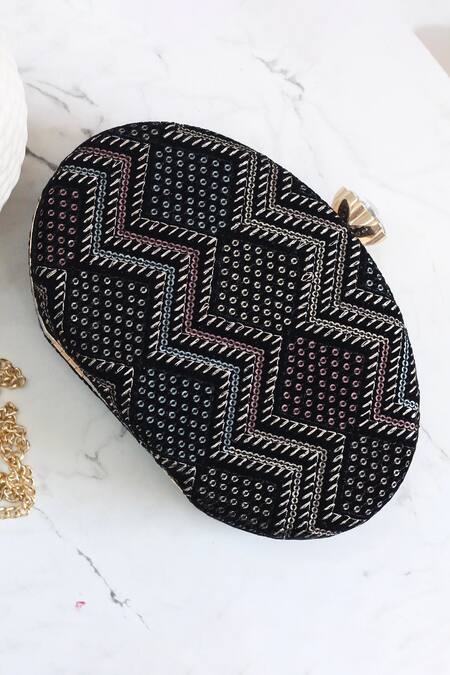 Buy_Boxwish By Bhumika_Black Sequins, Embroidery Velvet Oval Shaped Clutch_at_Aza_Fashions