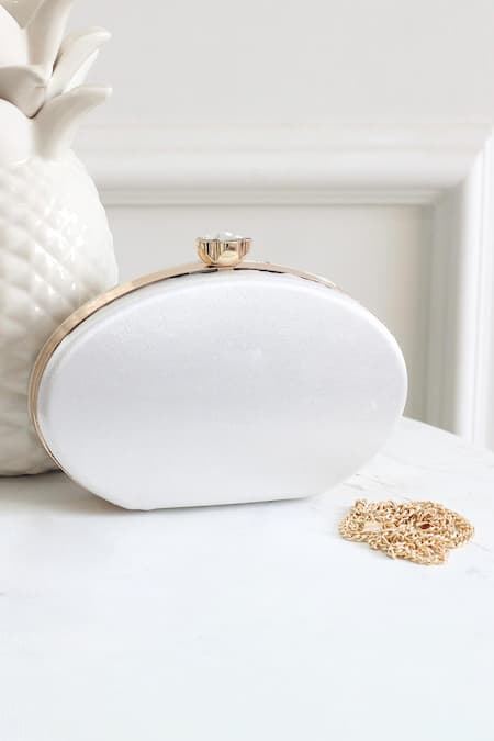 Cream oval shaped clutch featuring zari thread and sequin embroidery in a floral pattern. It includes a diamond floral knob and a metallic detachable sling chain.