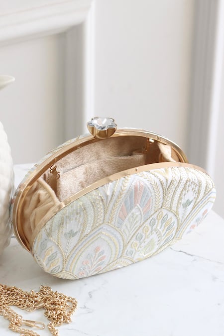 Diamond finger holder knob, Metallic detachable sling chain, Intricate floral sequin embroidery