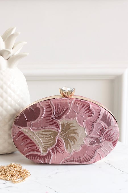 Pink oval shaped clutch featuring floral print and thread embroidery