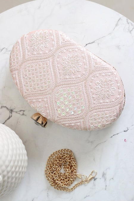 Peach oval shaped clutch featuring thread and sequin embroidery in a Mughal floral pattern