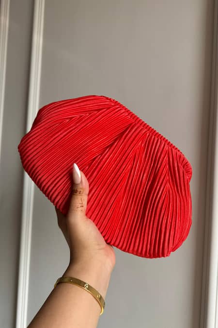 Red pleated crushed soft pouch clutch bag featuring a detachable sling chain. Made from a polyester blend, it is designed for versatile use.