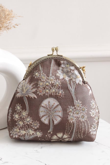 Brown Embroidery, Beads Embellished Floral Vintage Frame Clutch