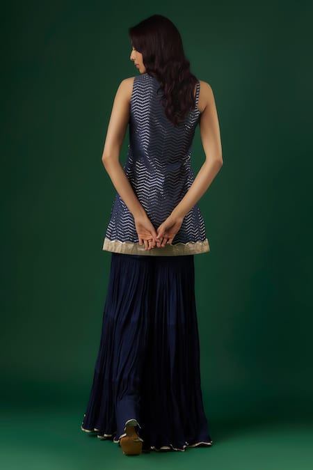 Blue Brocade, Georgette, Silk Sequins One Alkimia Chevron Kurta Sharara Set