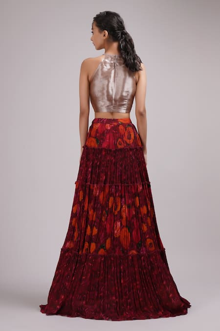 Wine lehenga featuring multi-color rosette prints with pleated design. Paired with a padded textured blouse and a printed dupatta.