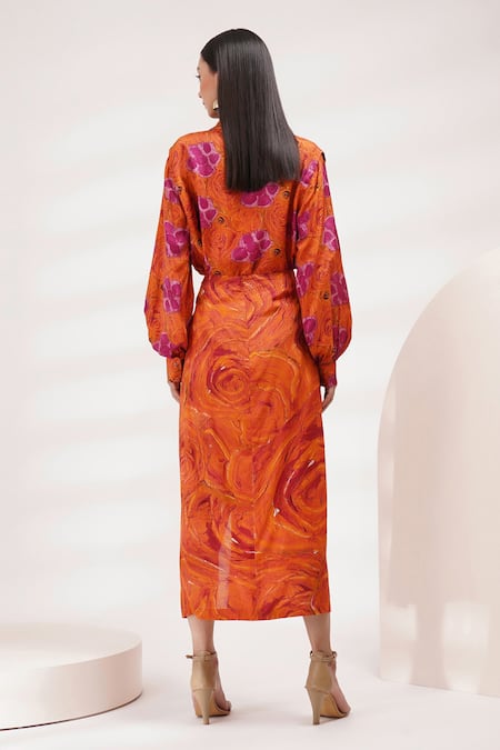 Orange and pink shirt featuring a collar, puffed sleeves, and front buttons. Paired with a front slit draped skirt.