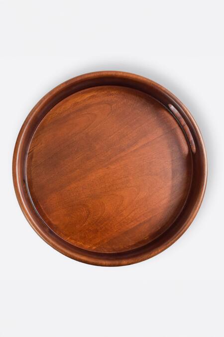 Brown circular-shape serving tray with mahogany finish and cutout handles.