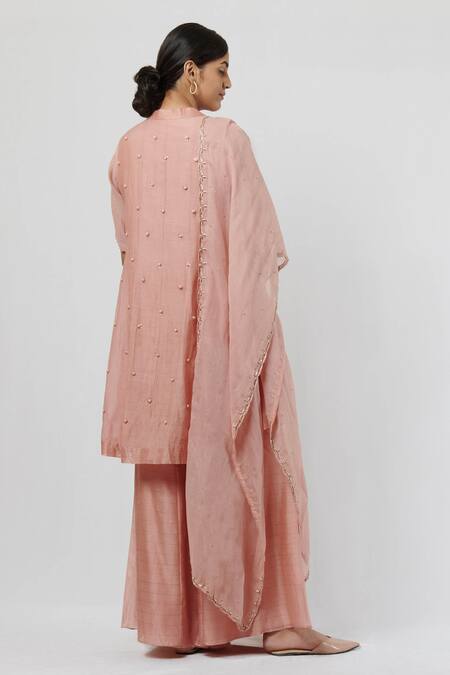 Vintage pink kalidar kurta highlighted with handcrafted potli, sequin embellishments, mandarin collar and loop trim sleeves. Comes with checkered palazzo and dupatta.