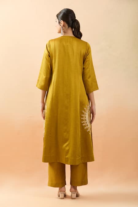 Mustard yellow kurta featuring floral applique and zari thread embroidery. Paired with matching pant and scallop bordered dupatta.
