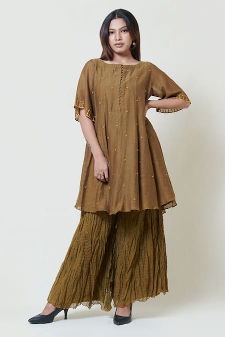 Champagne gold kurta with all over embroidered motifs. Comes with crushed flared pant.
