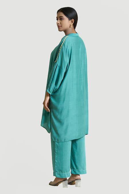Blue tunic featuring a shirt collar and long sleeves with an embroidered design. Paired with straight fit pants, the tunic showcases tiny floral motifs and is adorned with handcrafted potlis and pearls.