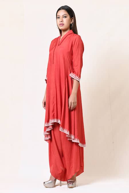Hand embroidered floral motifs on kurta neckline >Machine embroidered motifs on sleeve hems & kurta hem >Scallop border on sleeve hems >Scallop hem on kurta >Asymmetric hem on pant