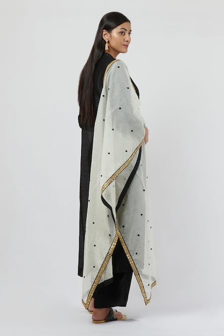 Black kurta with button placket, band collar, full sleeves and straight silhouette. Comes with pant and ivory gota patti dupatta.