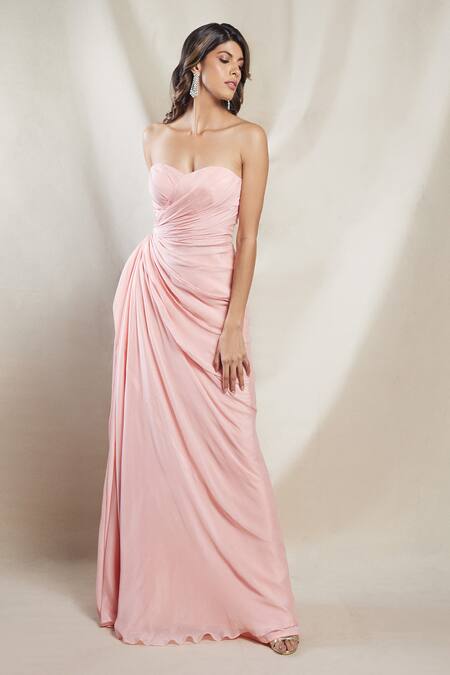 Baby pink gown featuring an off shoulder sweetheart neckline with one side pleated cowl draped overlap panels