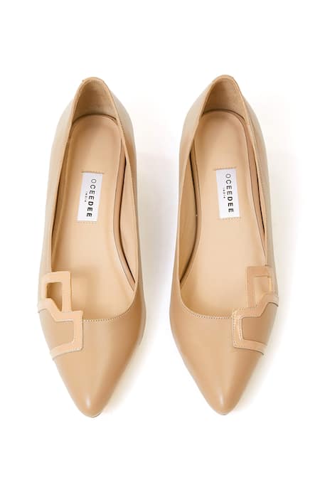 Beige mule block heels featuring cutwork and pointed toe detailing
