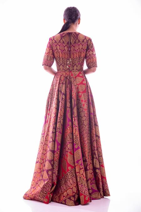 Wine and deep red shade anarkali with all-over woven motifs, with pleats and flare. Paired with a banarasi georgette dupatta in deep red.