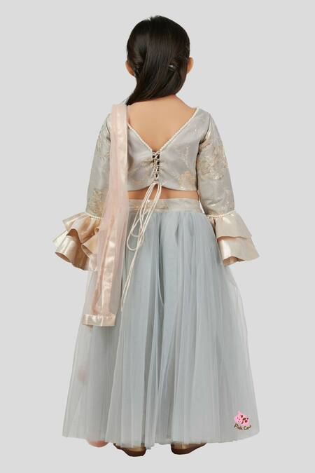 Buy_Pinkcow designs pvt ltd_Grey Brocade, Net Pearls, Fabric Flowers Blouse With Lehenga Set_Online_at_Aza_Fashions