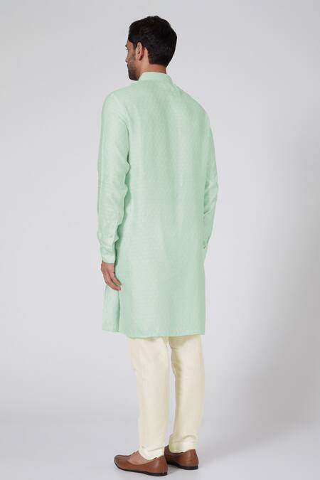 Mint jacquard silk kurta with mandarin collar & front buttons. Paired with churidar.