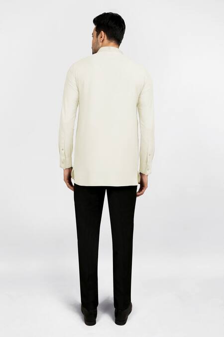 Off white shirt style short kurta with embroidered collar, placket & full sleeves.